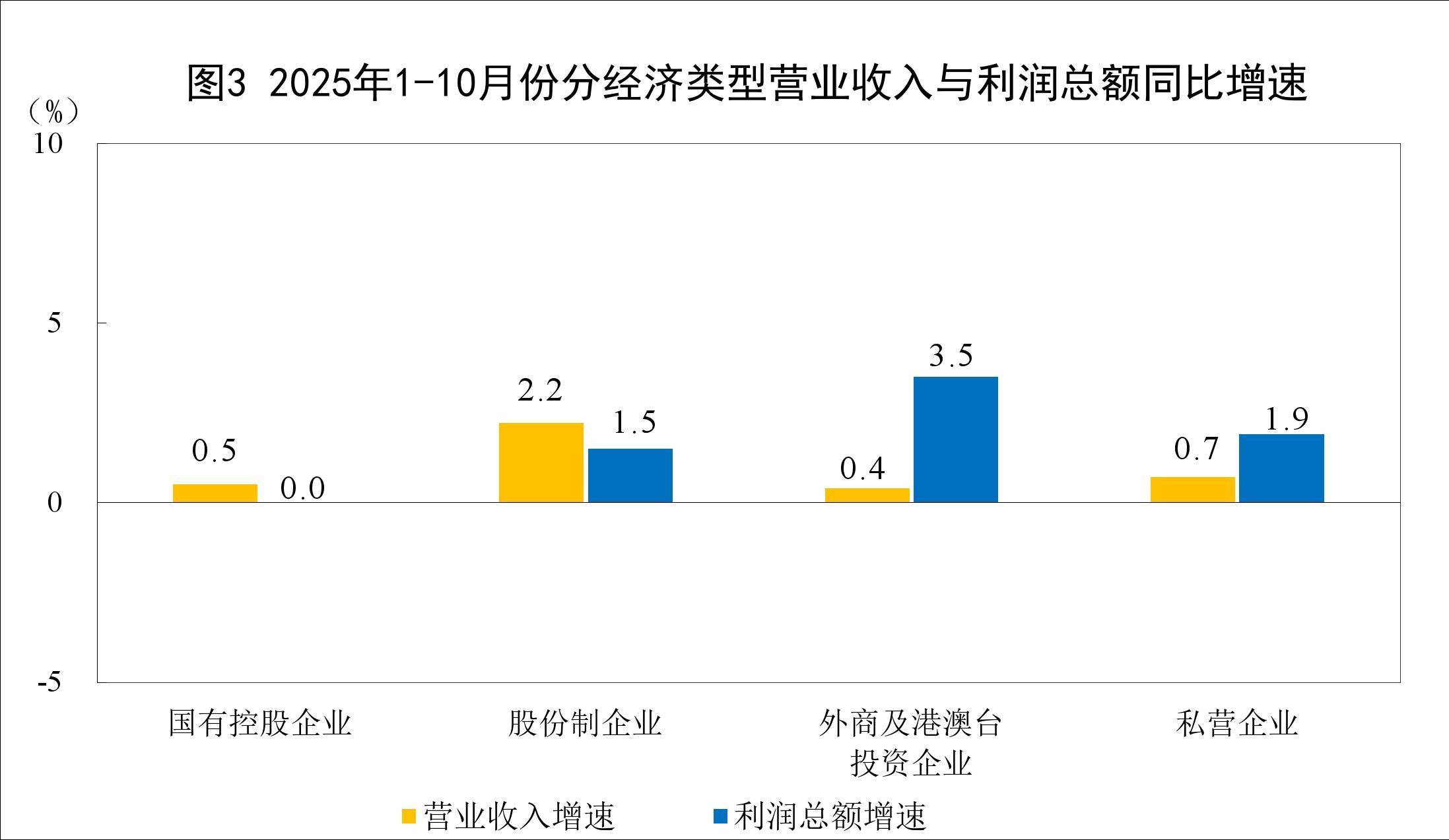 r1—10月份,规模以上工业企业中,国有控股企业实现利润总额18490.2亿元,同比持平;股份制企业实现利润总额44328.3亿元,增长1.5%;外商及港澳台投资企业实现利润总额14848.6亿元,增长3.5%;私营企业实现利润总额16995.6亿元,增长1.9%。