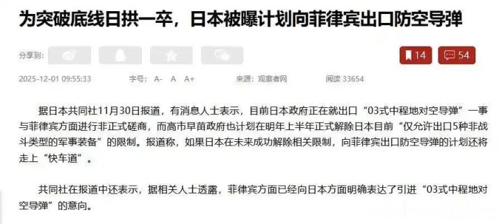 日本向菲律宾出口导弹,是针对中国的核心利益地区进行的军事布局,严重挑衅了中国的主权和领土完整。此前,日本政客高市早苗曾宣称“台湾有事即日本有事”,此次军售行为与她的言论相呼应,将台湾问题与日本的国家安全紧密联系在一起,引发了中国的强烈不满和坚决反对。