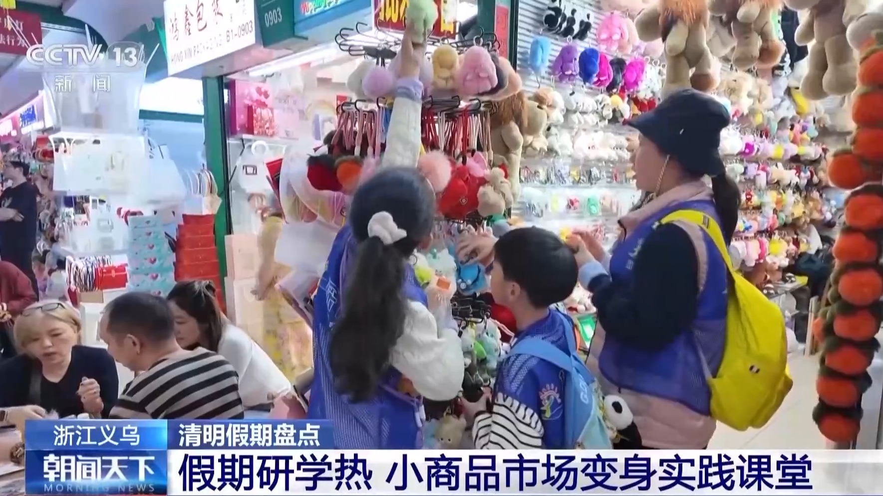 扬州某研学团带队老师 刘厚兆:他们在义乌有个体验商品从购买到销售的过程,每个人都有50元的启动资金,第二天卖多少,那就看各自发挥。走进市场,五年级学生闵姝扬和小伙伴立刻被琳琅满目小商品吸引。经过一番比价,她入手了一款单价5元的“柿柿如意”毛绒挂件,为后续销售留足了资金。同样读五年级的陈胤豪则更有商业意识,得知每个挂件进货价3元后,他马上和好友凑钱批量购买。