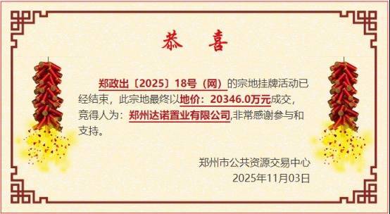 郑政出〔2025〕18号(网)地块被郑州达诺置业有限公司以底价20346万元摘得。