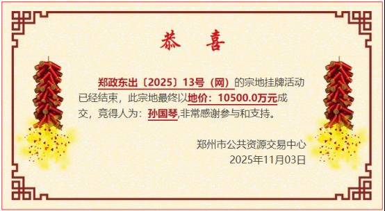 郑政东出〔2025〕13号(网)地块被孙国琴以10500万元摘得,溢价率达26.5%。