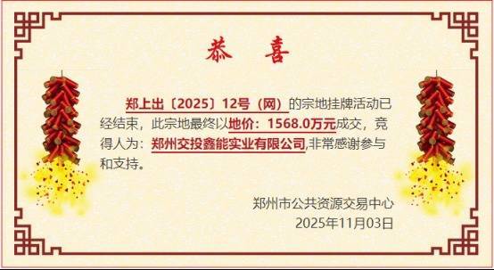 郑上出〔2025〕12号(网)地块被郑州交投鑫能实业有限公司以底价1568万元摘得。