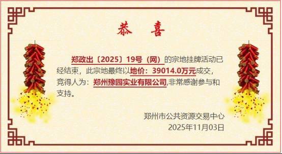 郑政出〔2025〕19号(网)地块被郑州豫园实业有限公司以底价39014万元摘得。