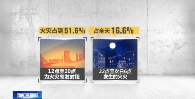 从时间上来看,12时至20时为火灾高发时段,这一时段发生的火灾占到51.6%,主要因为这个时段生产生活较为集中;夜间22点至次日6点发生的火灾占全天的16.6%,但造成627人遇难、621人受伤,伤亡占比较高。消防部门分析,这与夜间火灾发现晚、逃生迟缓有关。