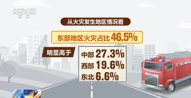 从火灾发生地区情况看,东部地区火灾占比46.5%,明显高于中部(27.3%)、西部(19.6%)和东北(6.6%)。