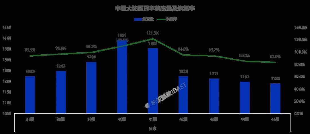 受民航换季及市场因素影响,中国大陆-日本周度航班量已大幅下滑,据航班管家数据,第45周(11.03-11.09)周航班量1189班次,恢复率(较2019年同期)为82.9%,环比第40周下降14.5%。