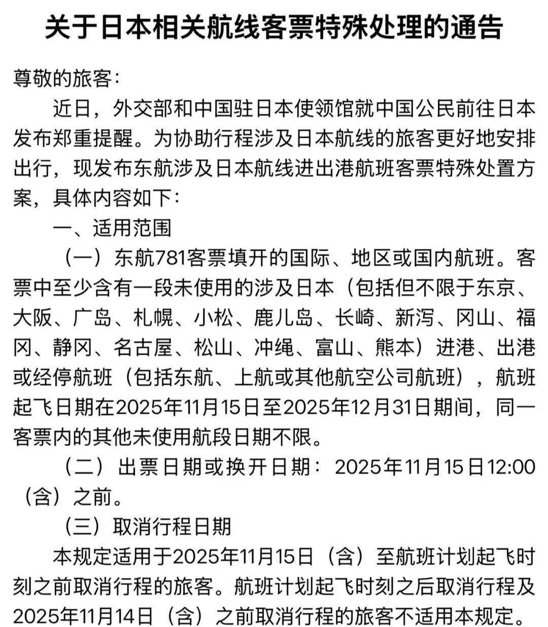 东航表示,为协助行程涉及日本航线的旅客更好地安排出行,现发布东航涉及日本航线进出港航班客票特殊处置方案,凡客票中至少含有一段未使用的涉及日本(包括但不限于东京、大阪、广岛、札幌、小松、鹿儿岛、长崎、新泻、冈山、福冈、静冈、名古屋、松山、冲绳、富山、熊本)进港、出港或经停航班(包括东航、上航或其他航空公司航班),航班起飞日期在2025年11月15日至2025年12月31日期间的,可免费变更一次,退票则免收退票手续费。